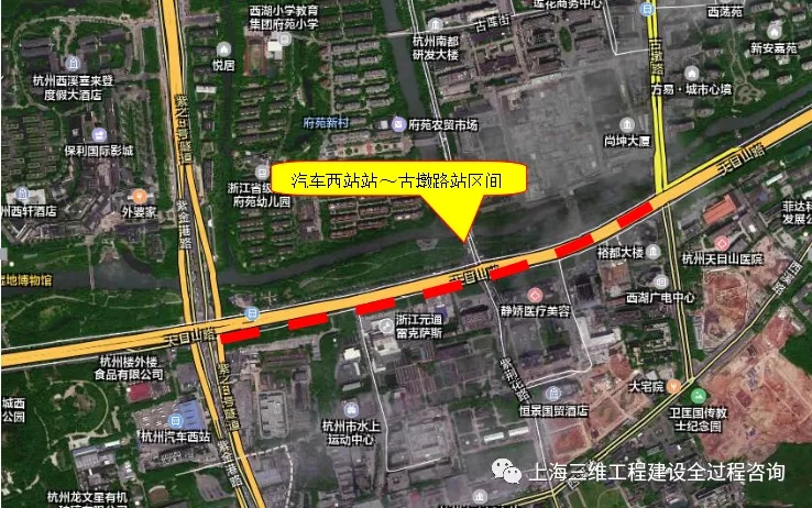 汽古區(qū)間主要沿天目山路依次上穿紫之隧道、下穿高壓輸電塔、平行下穿擬建快速路隧道、下穿9#箱涵、10#箱涵,共計(jì)998.914m。
