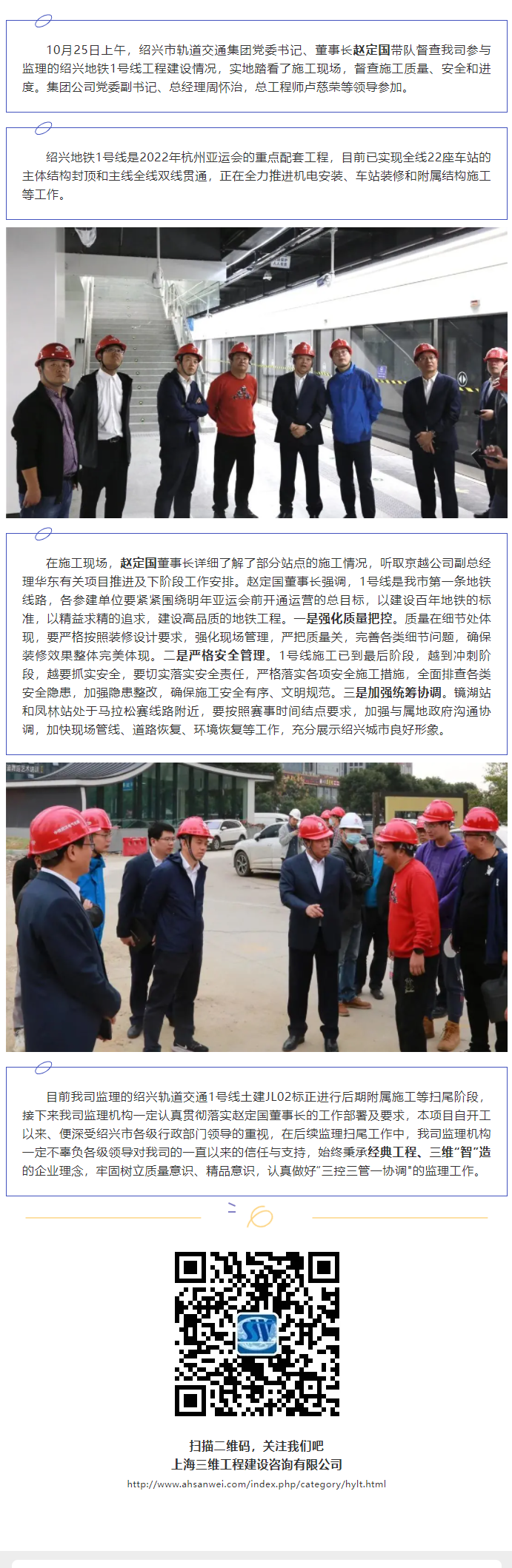 紹興市軌道交通集團(tuán)黨委書(shū)記、董事長(zhǎng)趙定國(guó)督查我司參與監(jiān)理的1號(hào)線(xiàn)工程建設(shè)進(jìn)展情況