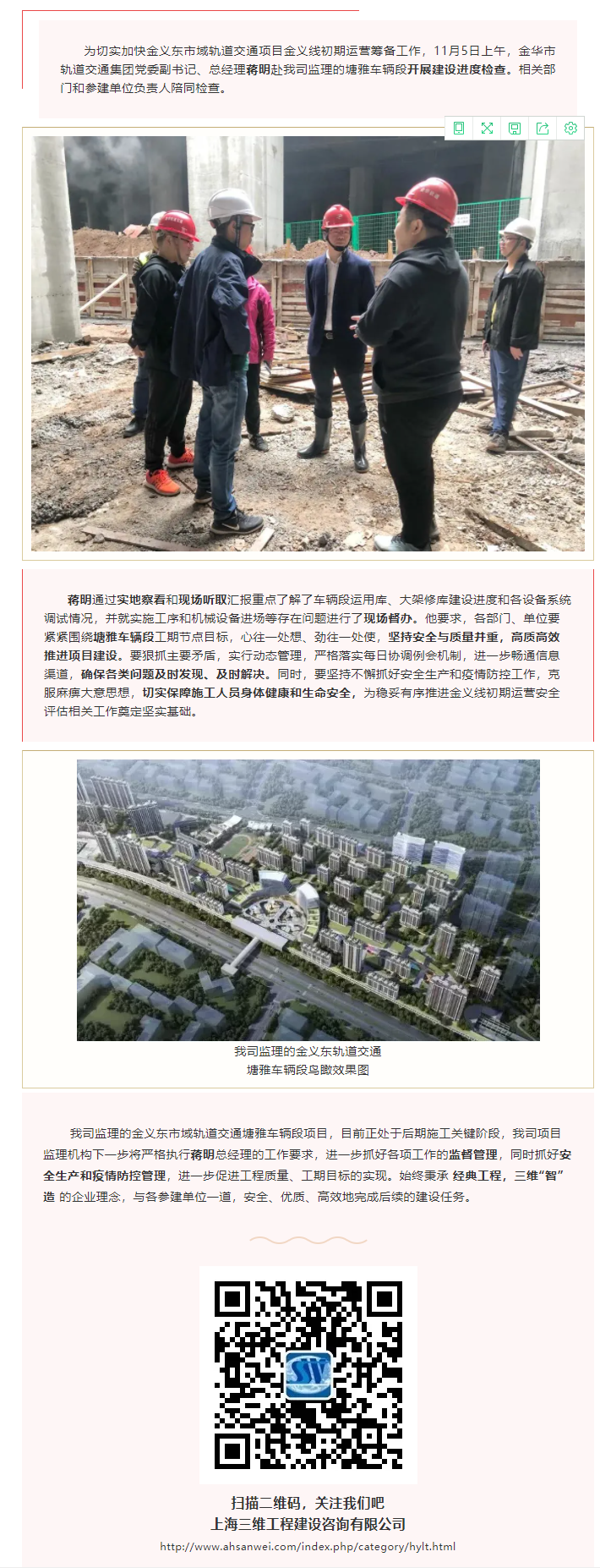 金華市軌道交通集團(tuán)黨委副書記、總經(jīng)理蔣明赴我司監(jiān)理的塘雅車輛段開展建設(shè)進(jìn)度檢查