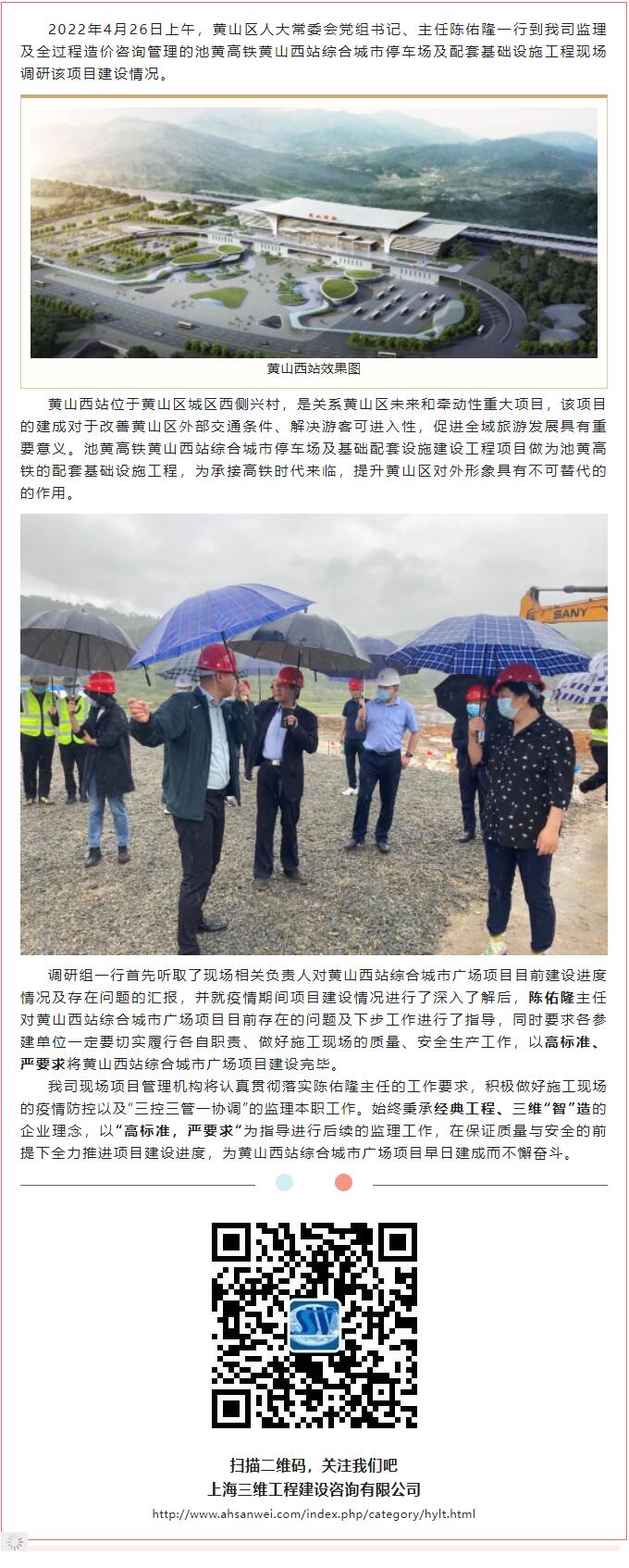 黃山區(qū)人大常委會(huì)主任陳佑隆一行調(diào)研由我司監(jiān)理及全過(guò)程造價(jià)咨詢管理的池黃高鐵黃山西站綜合城市停車(chē)場(chǎng)及配套基礎(chǔ)設(shè)施項(xiàng)目