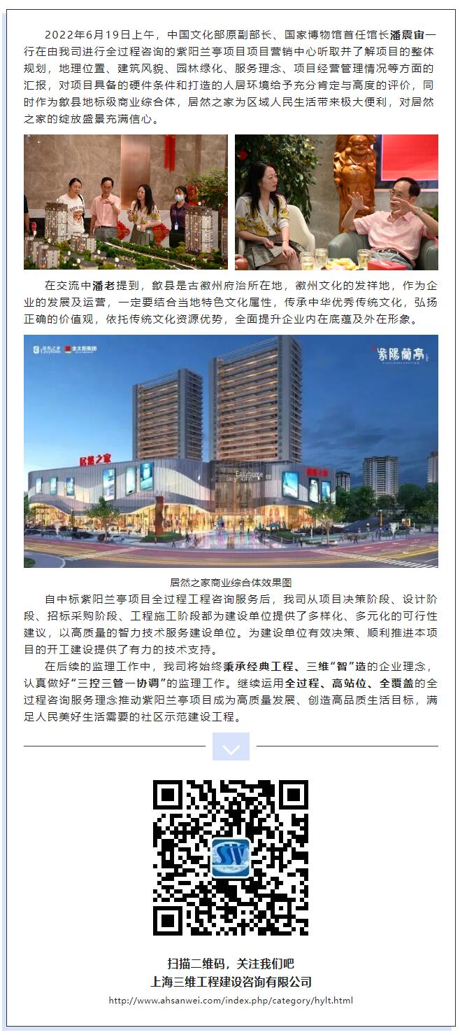 中國(guó)文化部原副部長(zhǎng)、國(guó)家博物館首任館長(zhǎng)潘震宙一行蒞臨由我司進(jìn)行全過(guò)程咨詢的歙縣紫陽(yáng)蘭亭項(xiàng)目觀摩指導(dǎo)