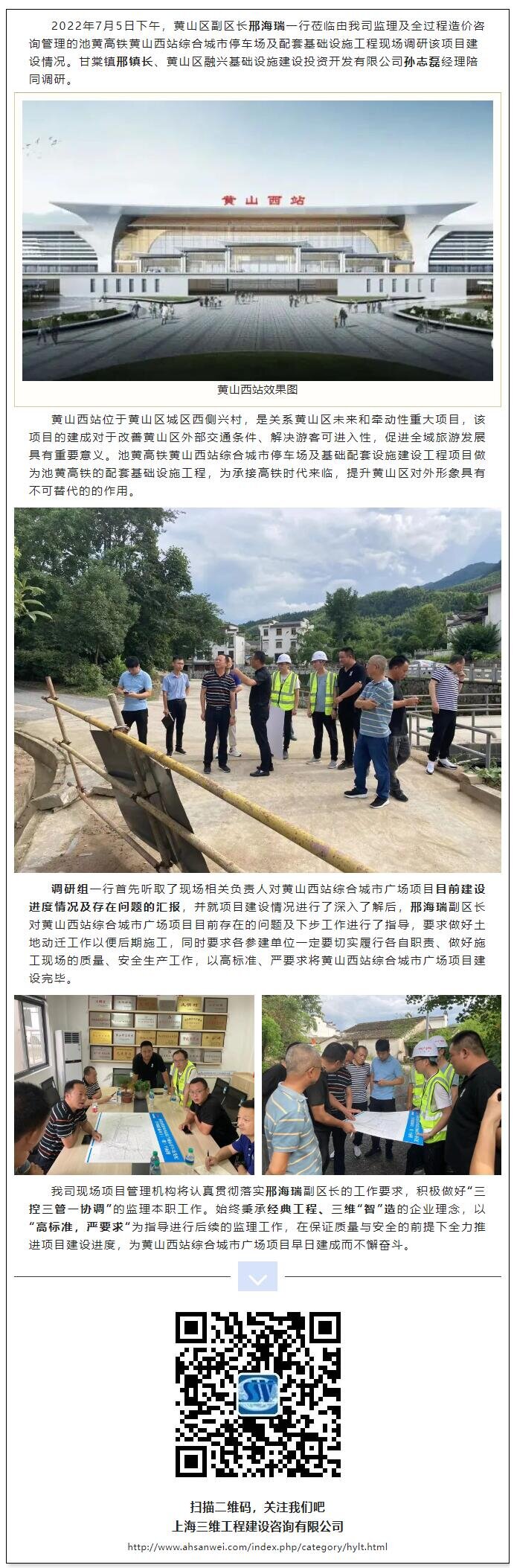 黃山區(qū)副區(qū)長邢海瑞一行調(diào)研我司監(jiān)理及全過程造價咨詢管理的池黃高鐵黃山西站綜合城市廣場項(xiàng)目