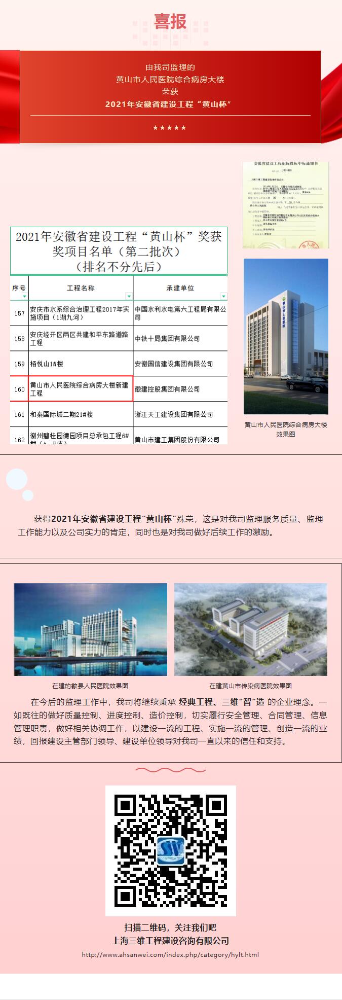 喜 報(bào) | 由我司監(jiān)理的黃山市人民醫(yī)院綜合病房大樓榮獲2021年安徽省建設(shè)工程“黃山杯”